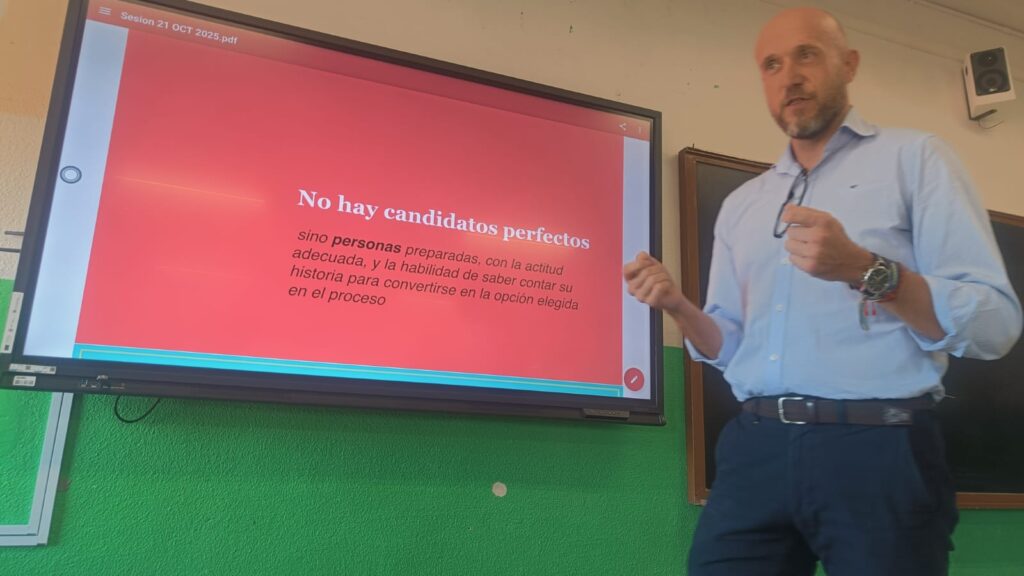 Durante el encuentro, el ponente compartió con los estudiantes claves fundamentales para su futura inserción laboral, explicando cómo se gestionan los procesos de selección en una gran empresa, qué competencias personales y técnicas se valoran más en los candidatos y qué oportunidades profesionales ofrece el sector de la electromecánica.