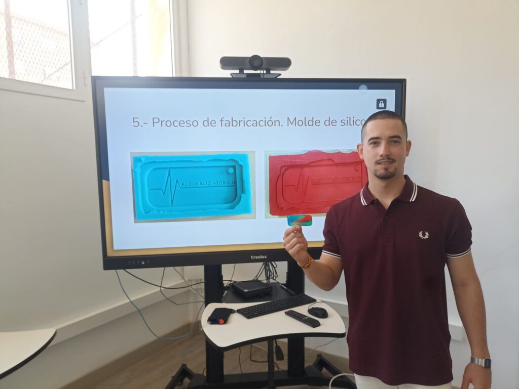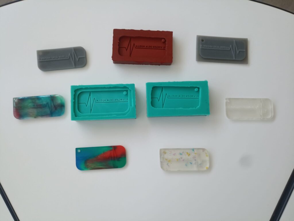 Este distintivo no es un llavero cualquiera. Su diseño parte del logotipo del Plan de Innovación del Centro y ha sido modelado con precisión mediante SolidWorks, un software profesional de diseño 3D. Para su fabricación, Héctor ha experimentado con distintos materiales y técnicas, desde el moldeo con resina epóxica hasta el vaciado de estaño en moldes de silicona roja, elaborados previamente con impresoras 3D. El proceso ha incluido ensayos, ajustes técnicos y una clara preocupación por el acabado, la seguridad y la sostenibilidad del producto.