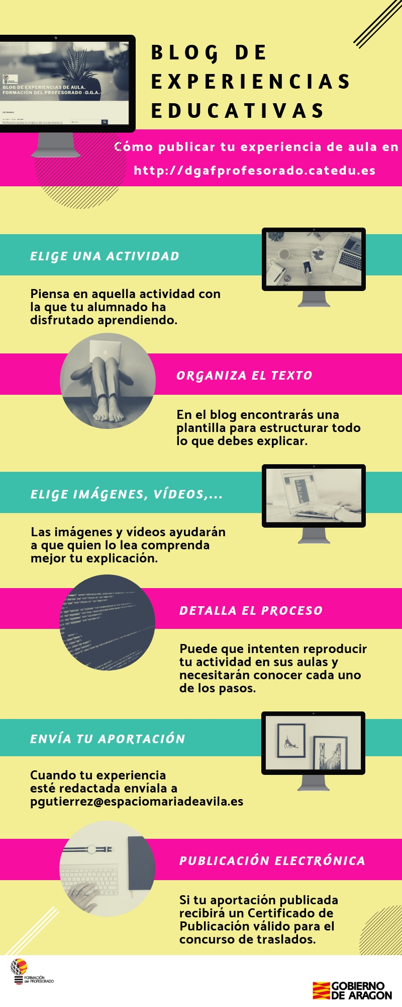 Puedes participar publicando tu experiencia en el Blog de Experiencias de Aula que, además de compartir la experiencia, certifica con ISSN (Número Internacional Normalizado de Publicaciones Seriadas).