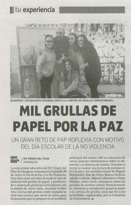 Hoy 11 de febrero en El Periódico de Aragón publican una noticia sobre nuestro reto de las 1000 grullas por la paz.