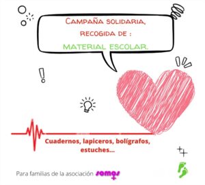 Nuevo curso y empezamos con las campañas solidarias. En este caso estamos recogiendo material escolar para las familias que lo necesitan de la Asociación SOMOS, formada por un grupo de mujeres víctimas de violencia de género.