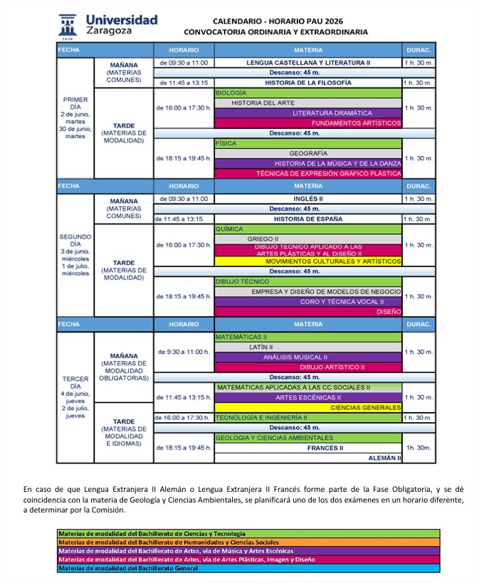 Información sobre las fechas y horario de realización de la PAU 2025-26