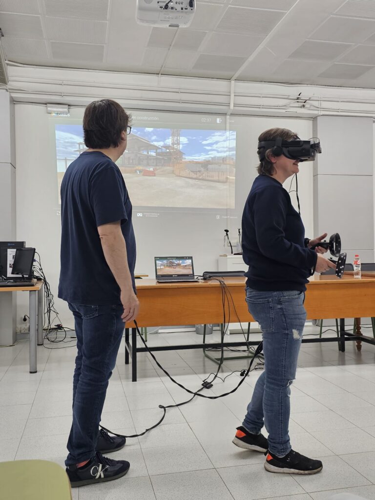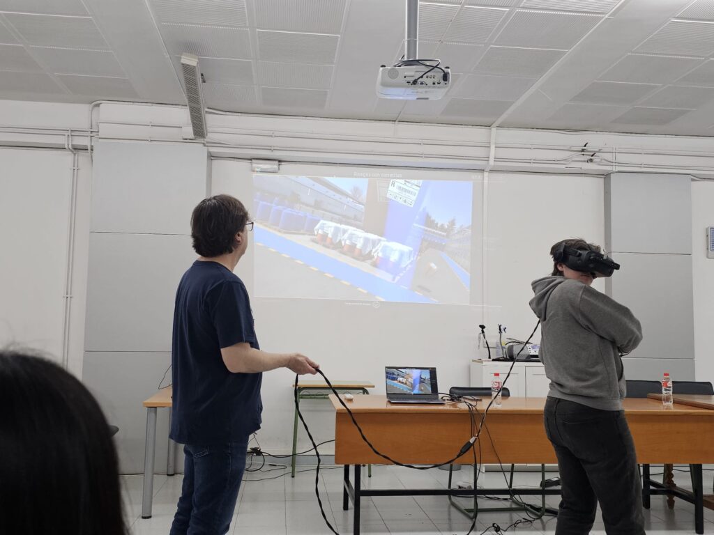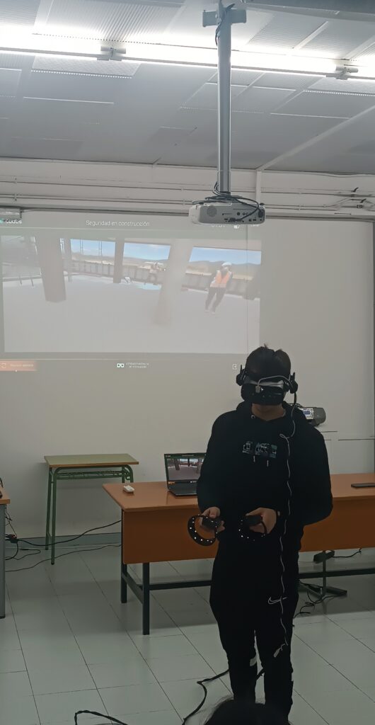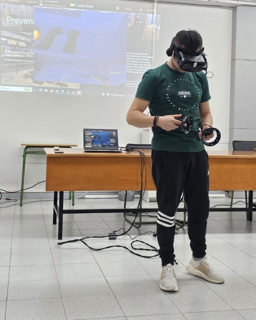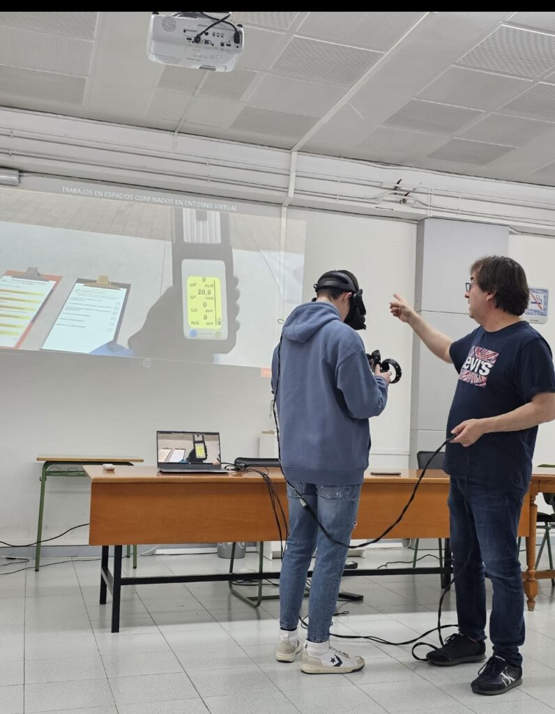 protocolos de seguridad, y «Querer trabajar seguro», fomentando una actitud y comportamiento proactivos por parte de todos los implicados. La parte más emocionante de la jornada llegó cuando el alumnado y profesorado tuvo la oportunidad de experimentar las nuevas formas de aprendizaje en prevención de riesgos laborales, gracias a la tecnología de realidad virtual. Equipados con gafas de VR, los estudiantes se sumergieron en entornos virtuales que simulaban situaciones de riesgo laboral, brindándoles una perspectiva inmersiva y práctica sobre los protocolos de
