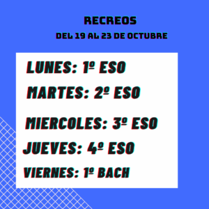 Los recreos van a ser más divertidos a partir del 19 de octubre. Eva y Ana, educadoras de nuestro PIEE, en colaboración con el Departamento de Educación Física y con la supervisión del profesorado del centro, han preparado diferentes propuestas para dinamizar los recreos. Todas las actividades se realizarán respetando las medidas sanitarias vigentes.