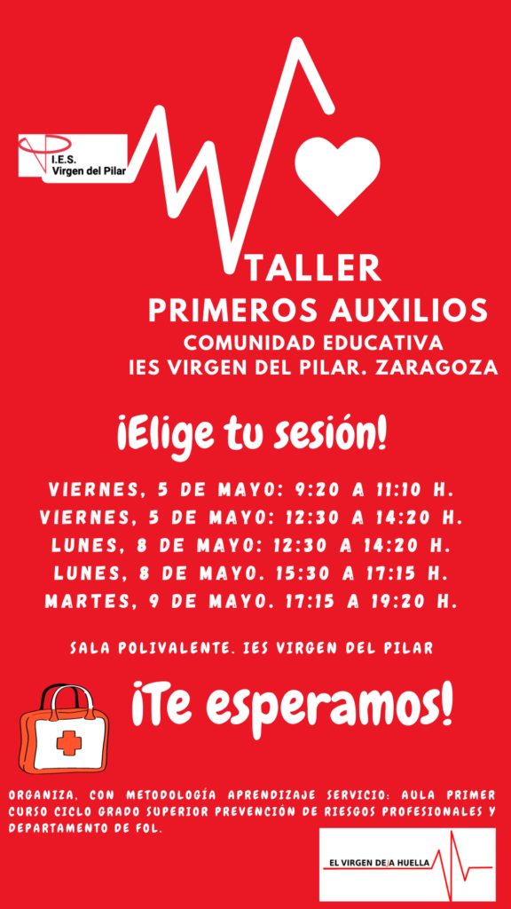 El pasado mes de mayo se realizaron diversos Talleres de Primeros Auxilios impartidos por el alumnado de primer curso del Ciclo Formativo de Prevención de Riesgos Profesionales de nuestro centro (Inmaculada Cantos, Ana Cristina Polo, Cady Christell García, Víctor Medina, Ángel Suñer y Víctor Lozano). Estas actividades fueron impulsadas por el Departamento de Formación y